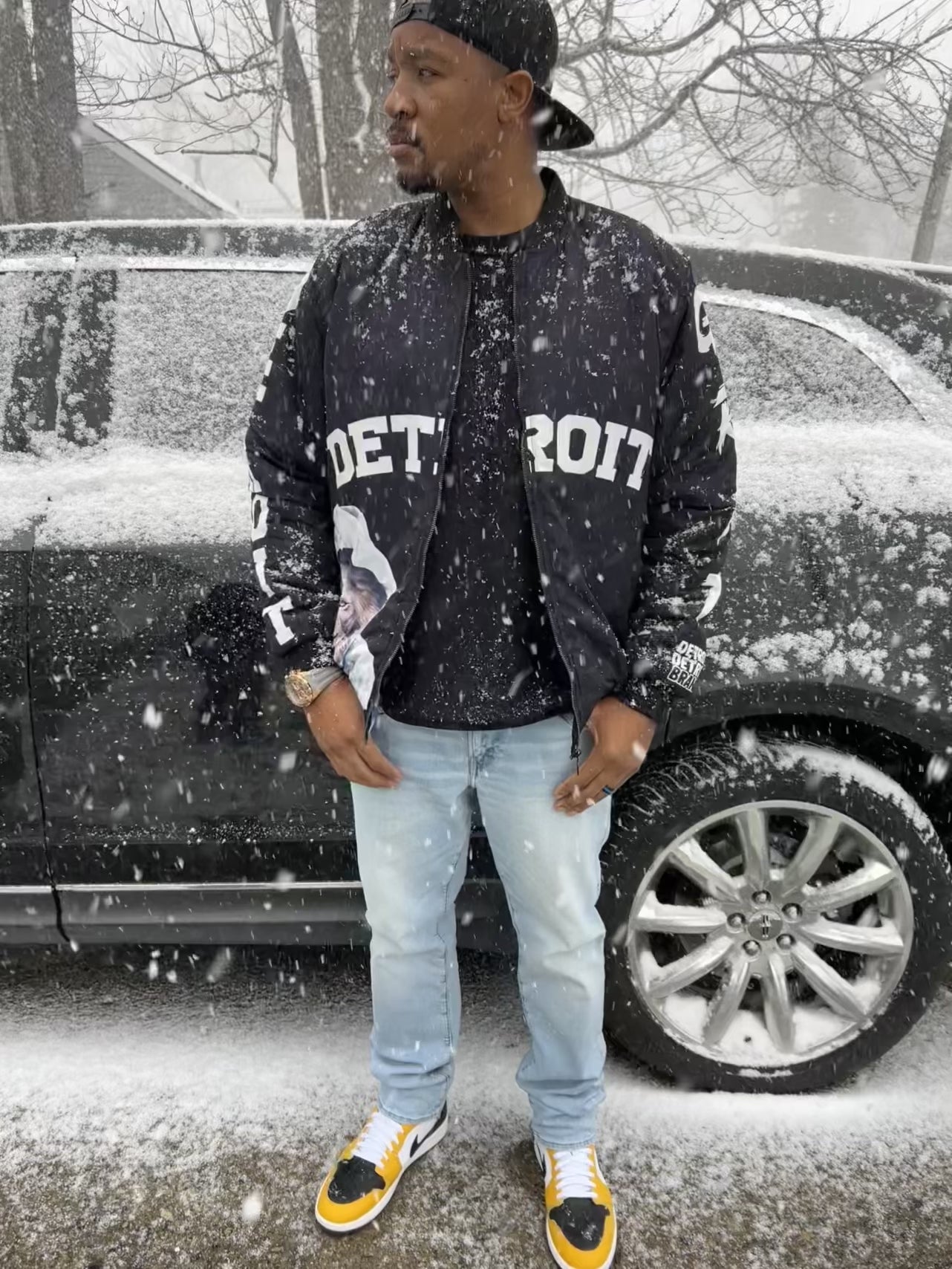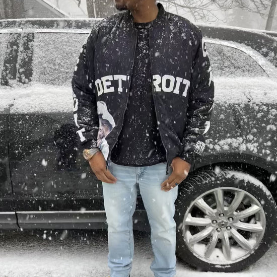 Featuring a striking graphic of a lion in a hoodie emerging from the shadows, this jacket symbolizes the raw power and unshakable confidence that defines the Motor City. The arched DETROIT lettering across the chest lets the world know where you stand: proud, powerful, and untamed.