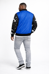 A dynamic Detroit bomber with blue splatter art and contrasting black & white sleeve styling.