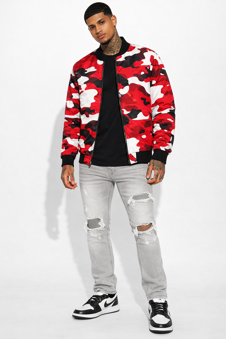 A bold red camo bomber blending black and white accents for a striking Detroit streetwear look