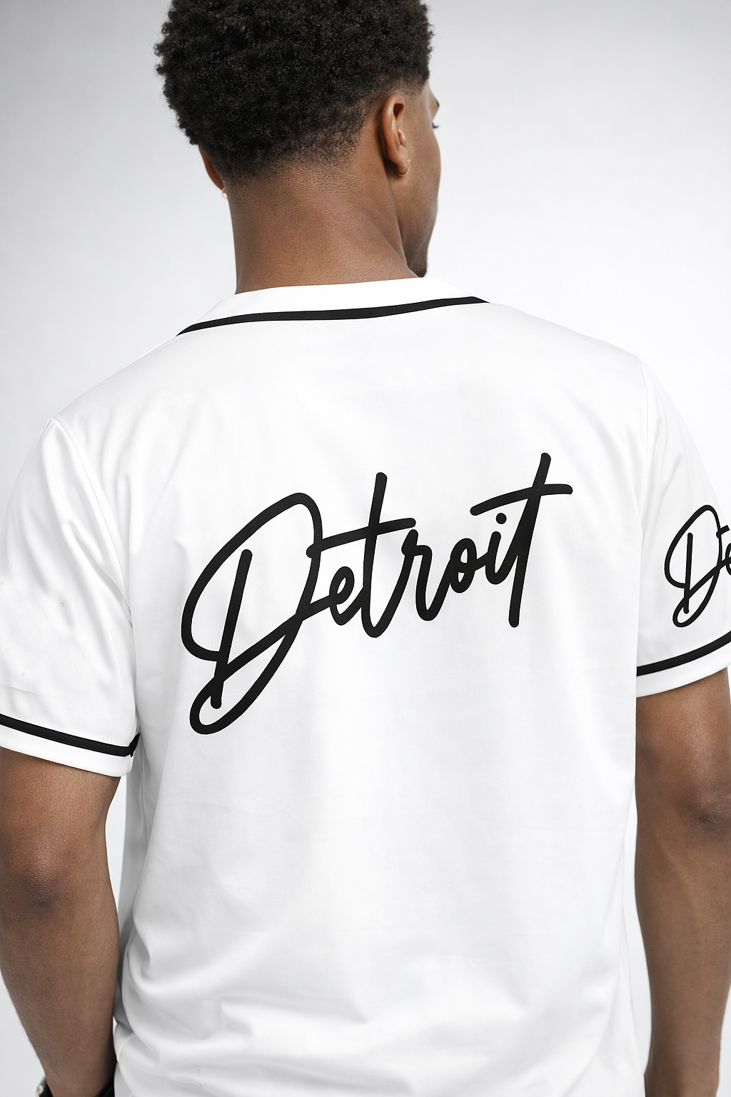 where classic sportswear meets urban flair. This sleek black jersey features bold white piping and buttons down the front, giving it a timeless, athletic look. The word “Detroit” is prominently embroidered on both the left chest and right sleeve in a stylish cursive font, adding a touch of city pride with modern edge.