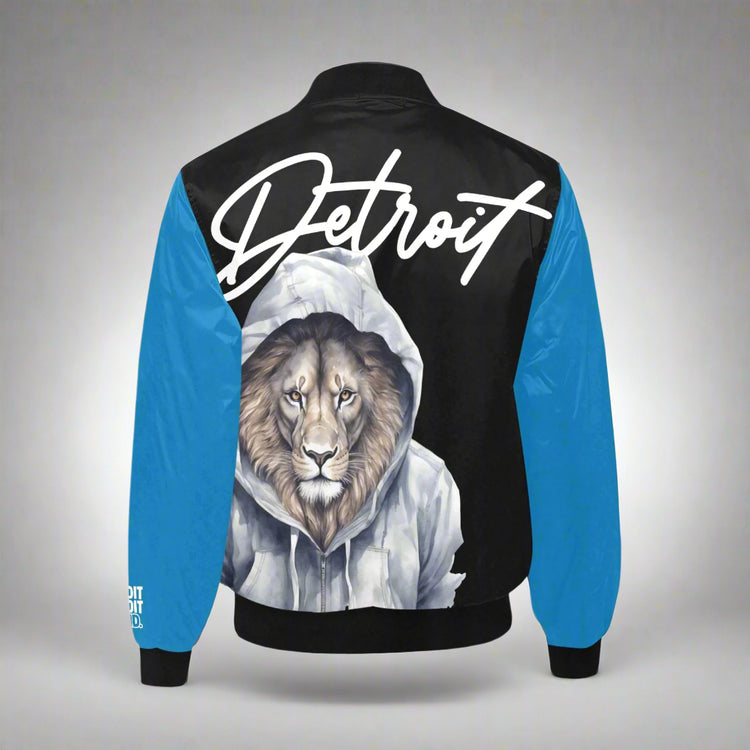A bold Detroit lion bomber with striking black-and-blue styling and premium artwork.