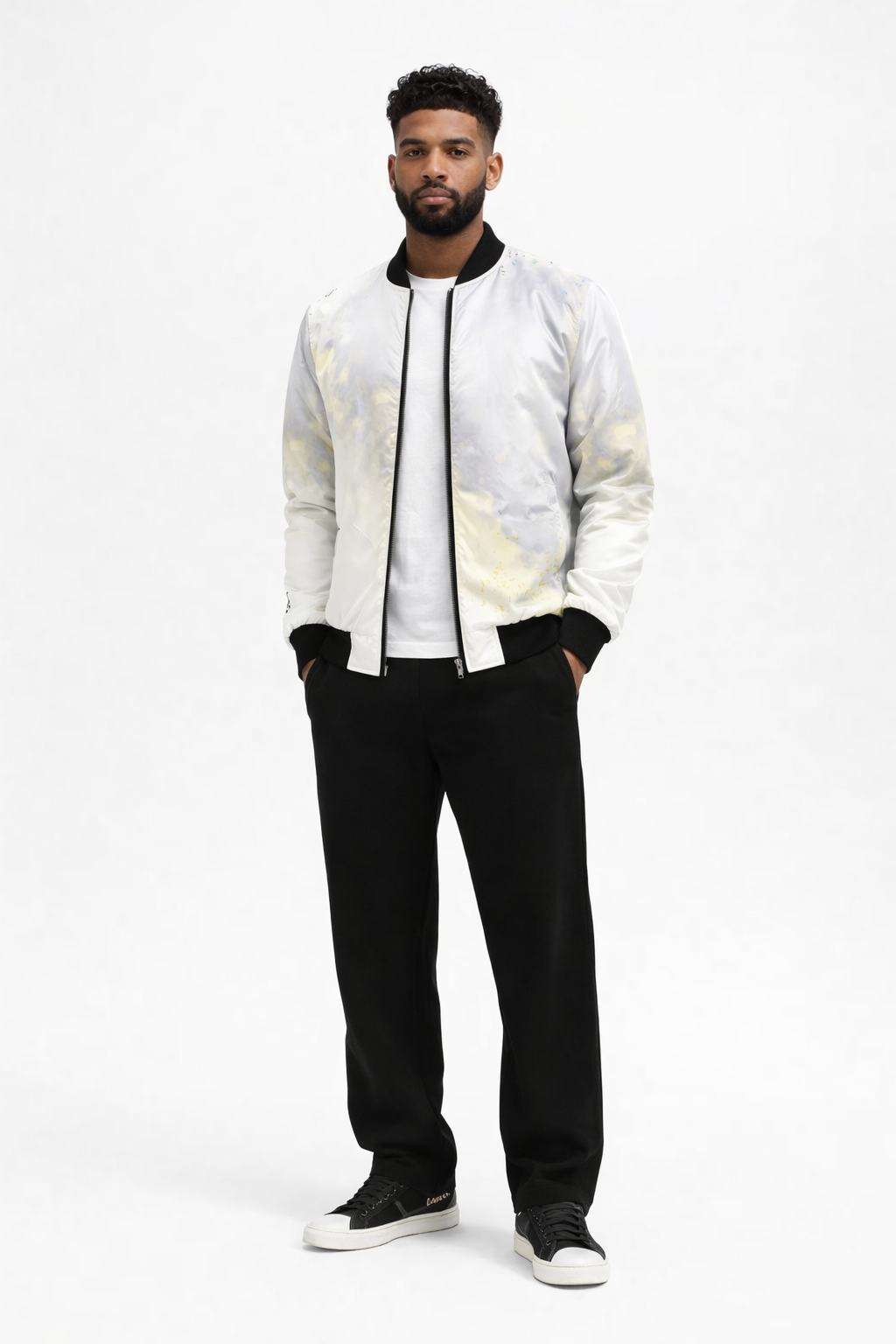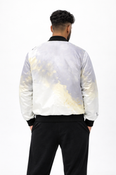 White, grey, and gold cloud-fade bomber jacket with black collar and cuffs, modern Detroit streetwear style