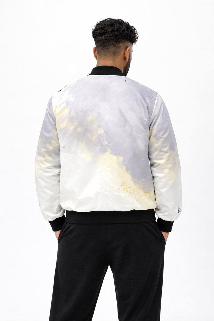 White, grey, and gold cloud-fade bomber jacket with black collar and cuffs, modern Detroit streetwear style Back view of white, grey, and gold cloud-fade bomber jacket with black collar and cuffs, Detroit streetwear style